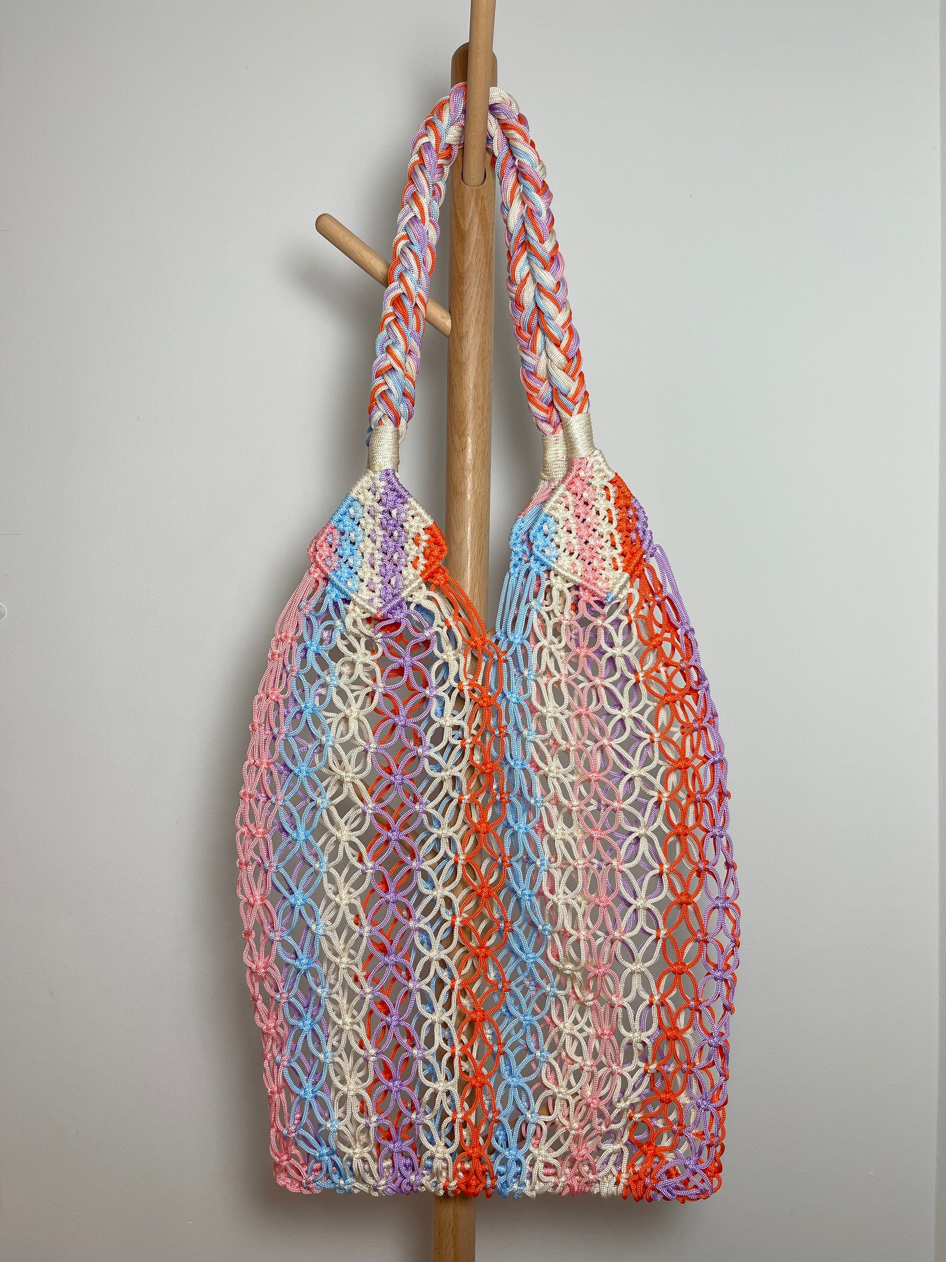 Esta bolsa artesanal está tejida a mano con técnica de macramé utilizando hilos resistentes y vibrantes. Ligera pero duradera, es ideal para tus paseos diarios, días de playa o para darle un toque especial a cualquier look.