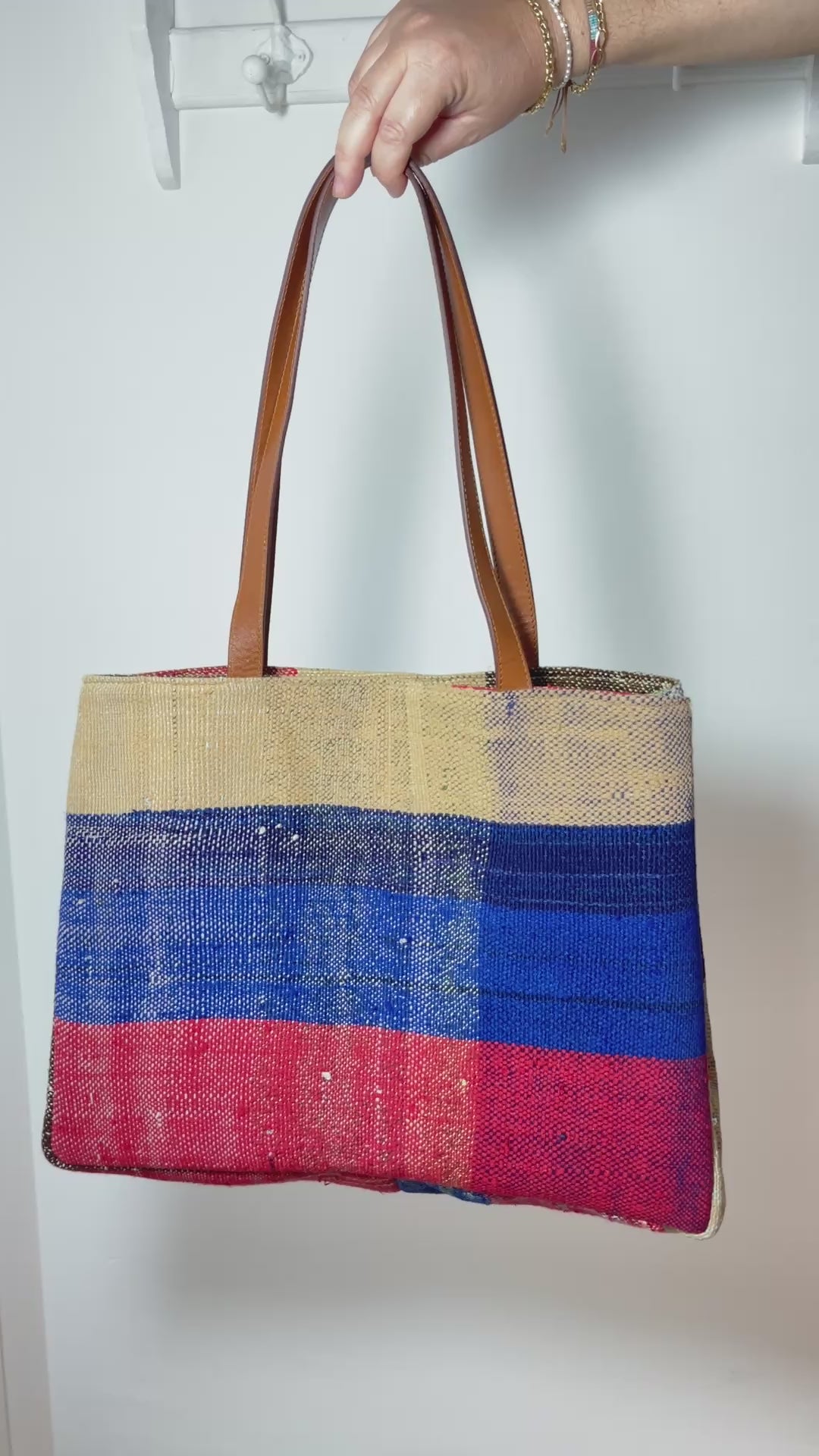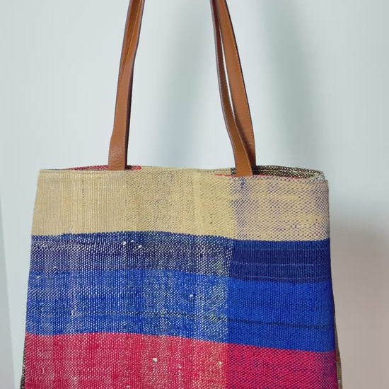 Confeccionado a partir de textiles reciclados y tejido a mano, cada bolso es una pieza irrepetible. Las asas están hechas con cuero natural tratado artesanalmente, lo que asegura durabilidad y comodidad.