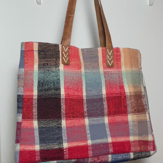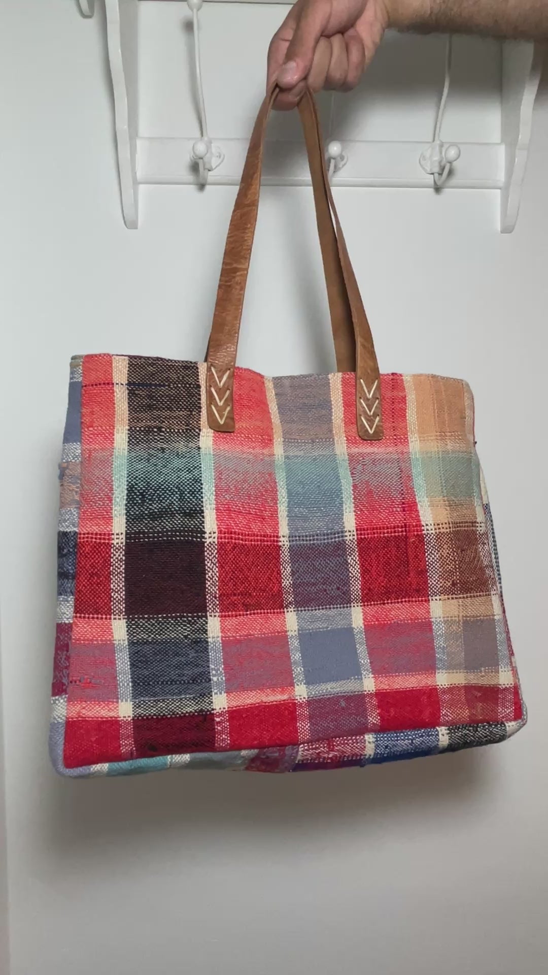 Confeccionado a partir de textiles reciclados y tejido a mano, cada bolso es una pieza irrepetible. Las asas están hechas con cuero natural tratado artesanalmente, lo que asegura durabilidad y comodidad.