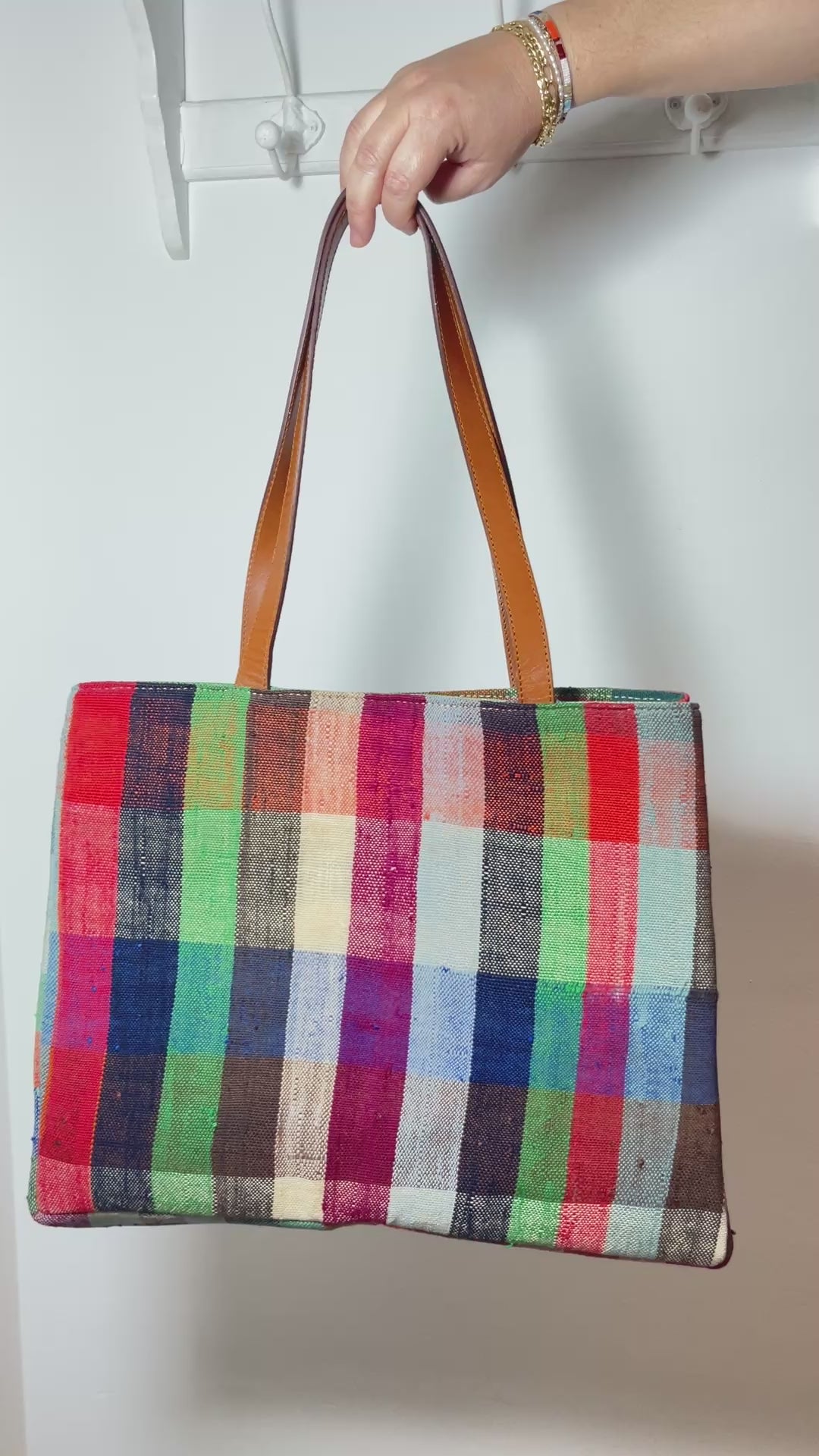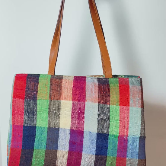 Confeccionado a partir de textiles reciclados y tejido a mano, cada bolso es una pieza irrepetible. Las asas están hechas con cuero natural tratado artesanalmente, lo que asegura durabilidad y comodidad.