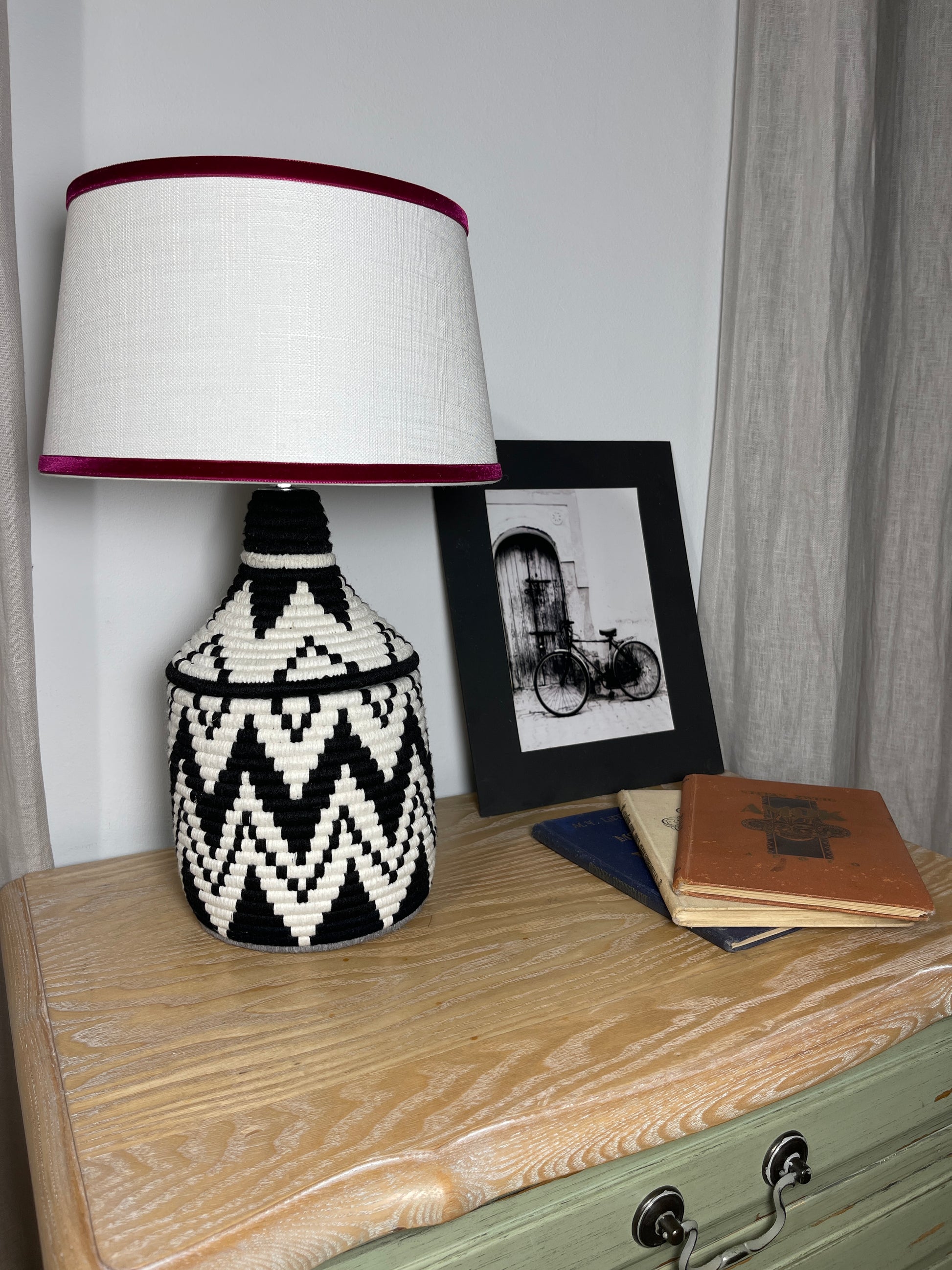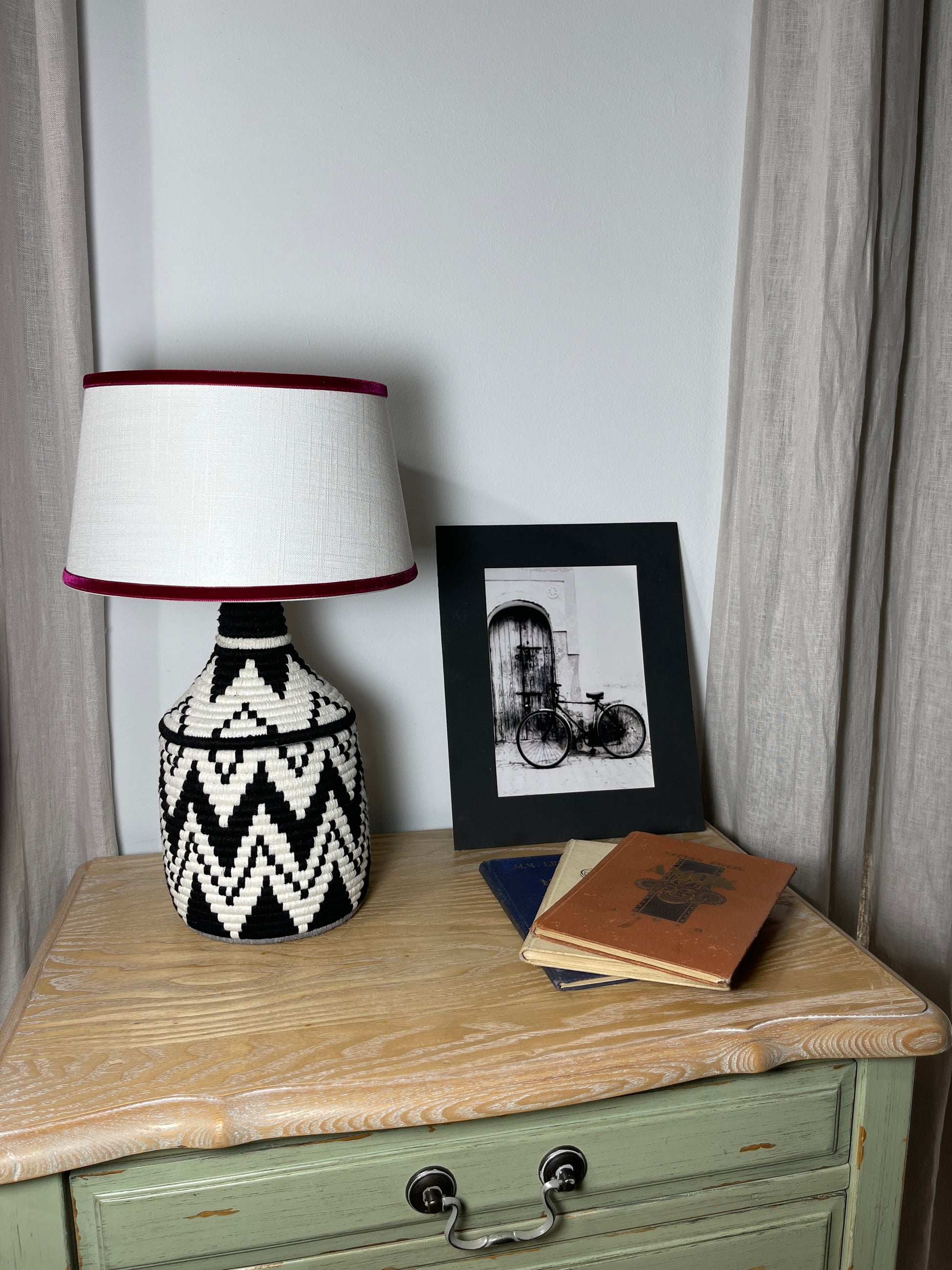 Se incluye la pantalla de lino en tono crudo con borde buganvilla.