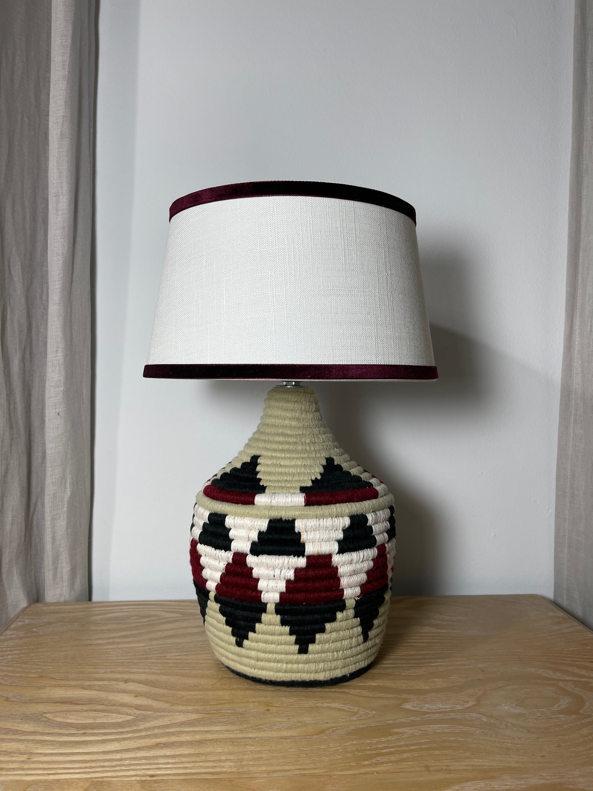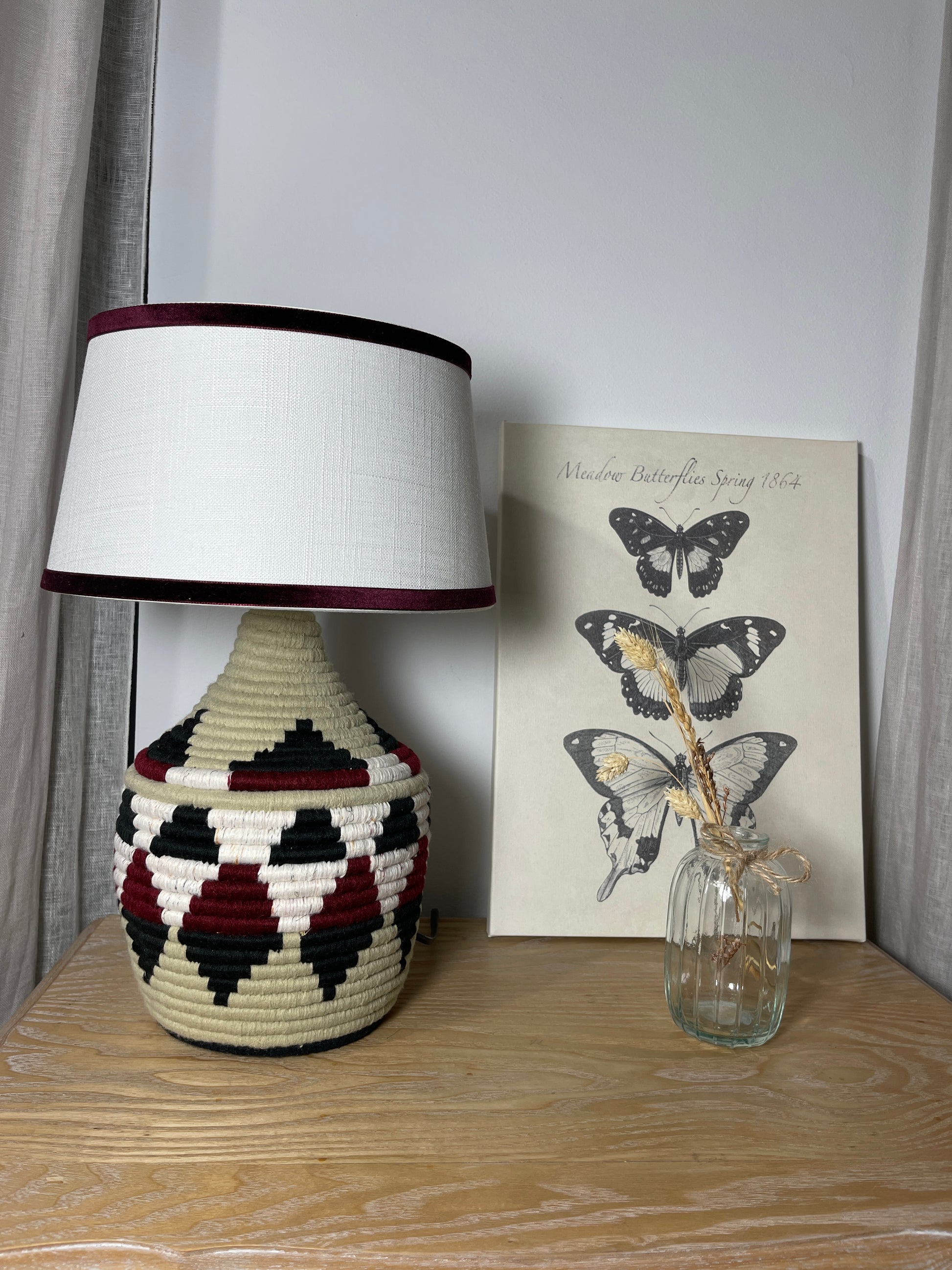 Se incluye la pantalla de lino en tono crudo con borde burdeos