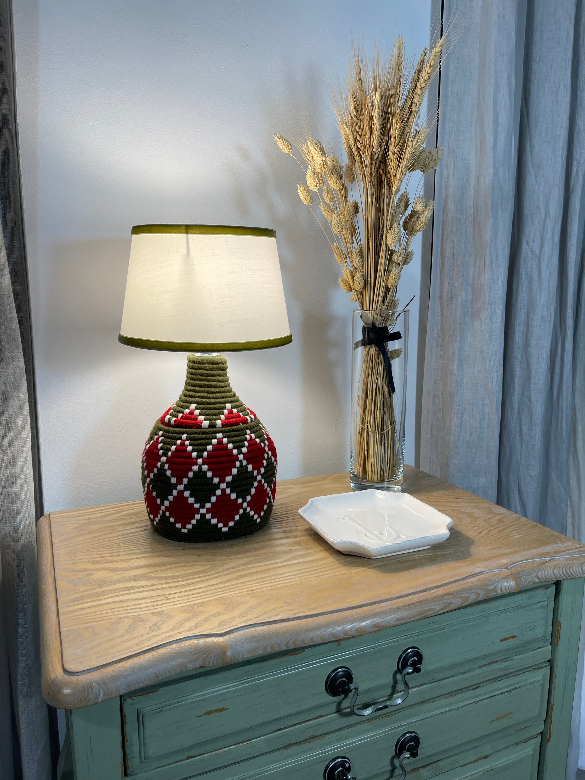 Se incluye la pantalla de lino en tono crudo con borde verde.