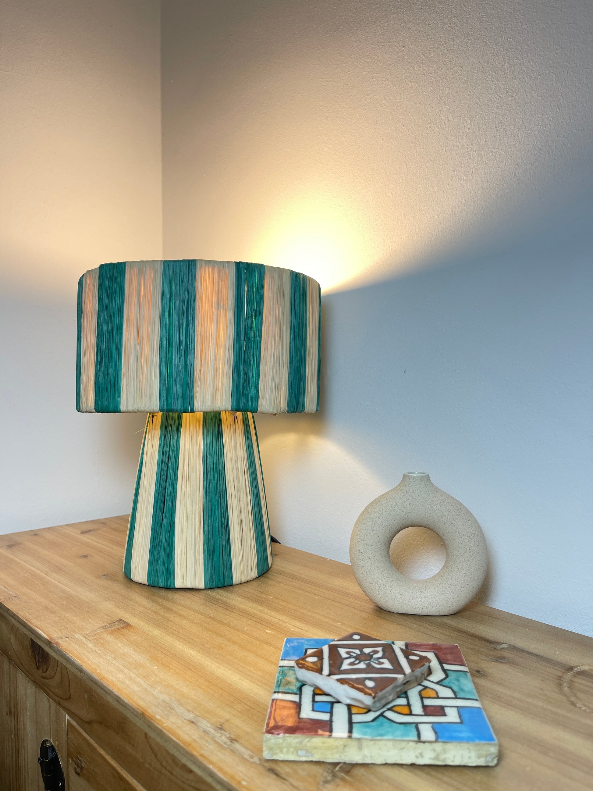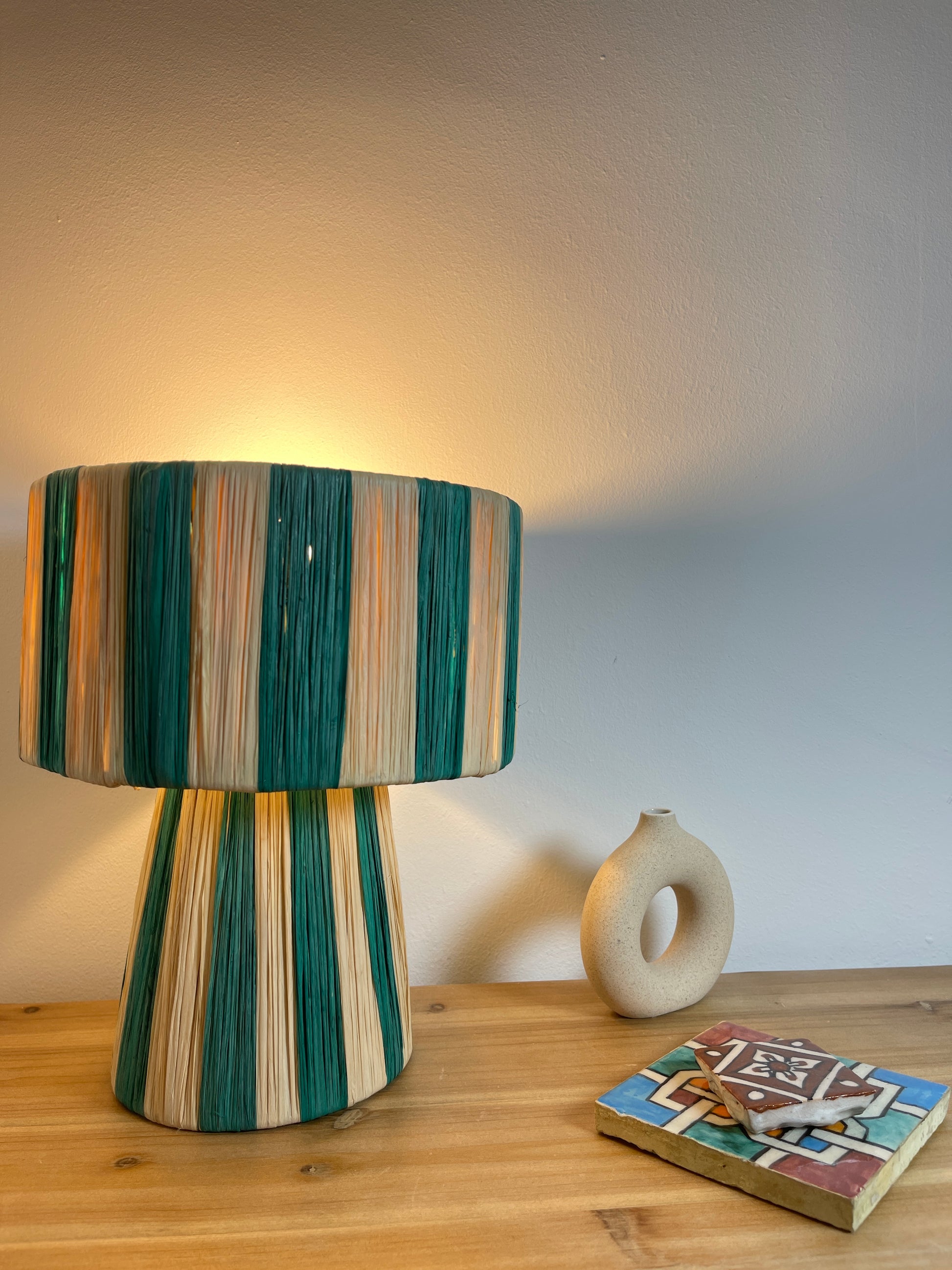 Esta lámpara de mesa artesanal es ideal para complementar la decoración de tu hogar. Elaborada con rafia, aporta un estilo natural y alegre a cualquier ambiente. Cuenta con un interruptor muy práctico para encenderla y apagarla, lo que la convierte en una opción decorativa, útil y de fácil mantenimiento.